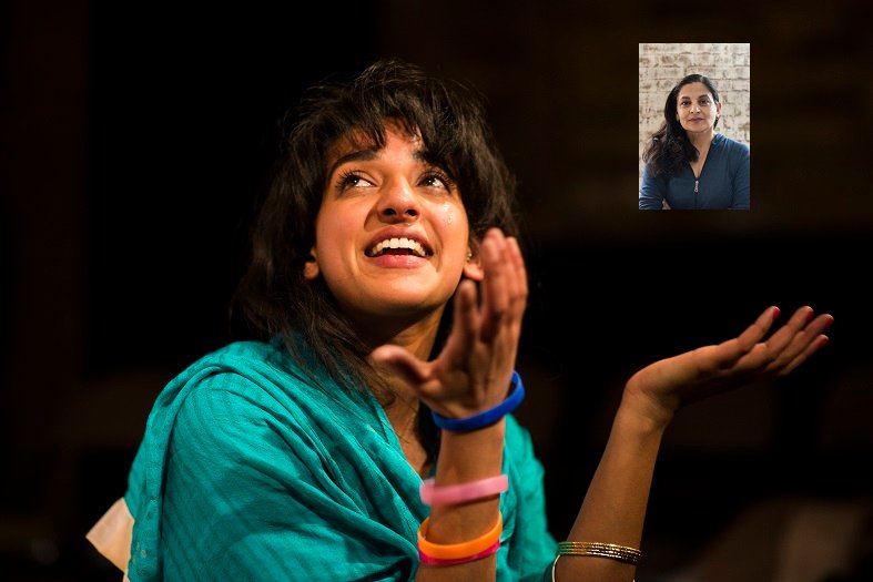 Main Picture: Suzy/Sajida (Karen Bartke) with Farhan (Umar Ahmed) in ‘My Name is…‘; inset Sudha Bhuchar ©Helen Maybanks